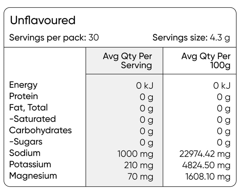 Our clean salty unflavoured electrolyte powder is all function, no fuss. Pure, crisp and salt-forward with zero added sweetness or flavours, perfect on its own or mixed with anything you fancy.